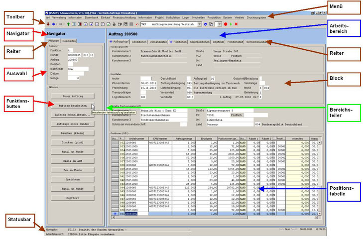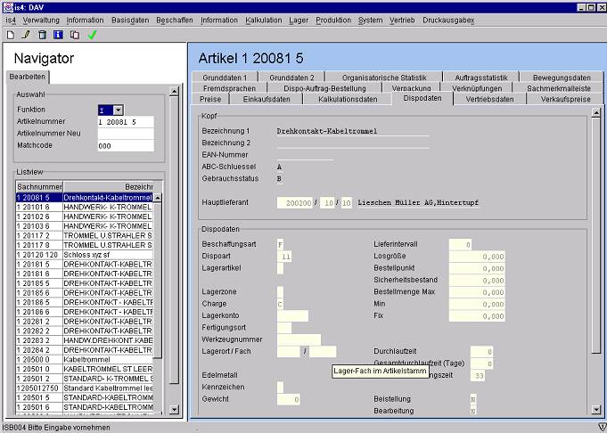 Artikelstamm, Transaktion DAV (Datenbank Artikel Verwaltung). Links der Navigator, hier sucht man den/die gewünschten